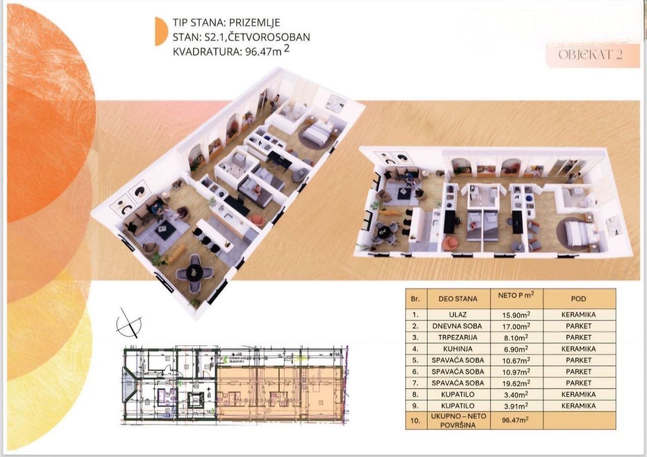 Veliko nam je zadovoljstvo što smo u mogućnosti da Vam ponudimo troiposoban stan 96.47m², u prizemlju zgrade, koja se nalazi na odličnoj lokaciji, svega 2 km od centra Obrenovca.