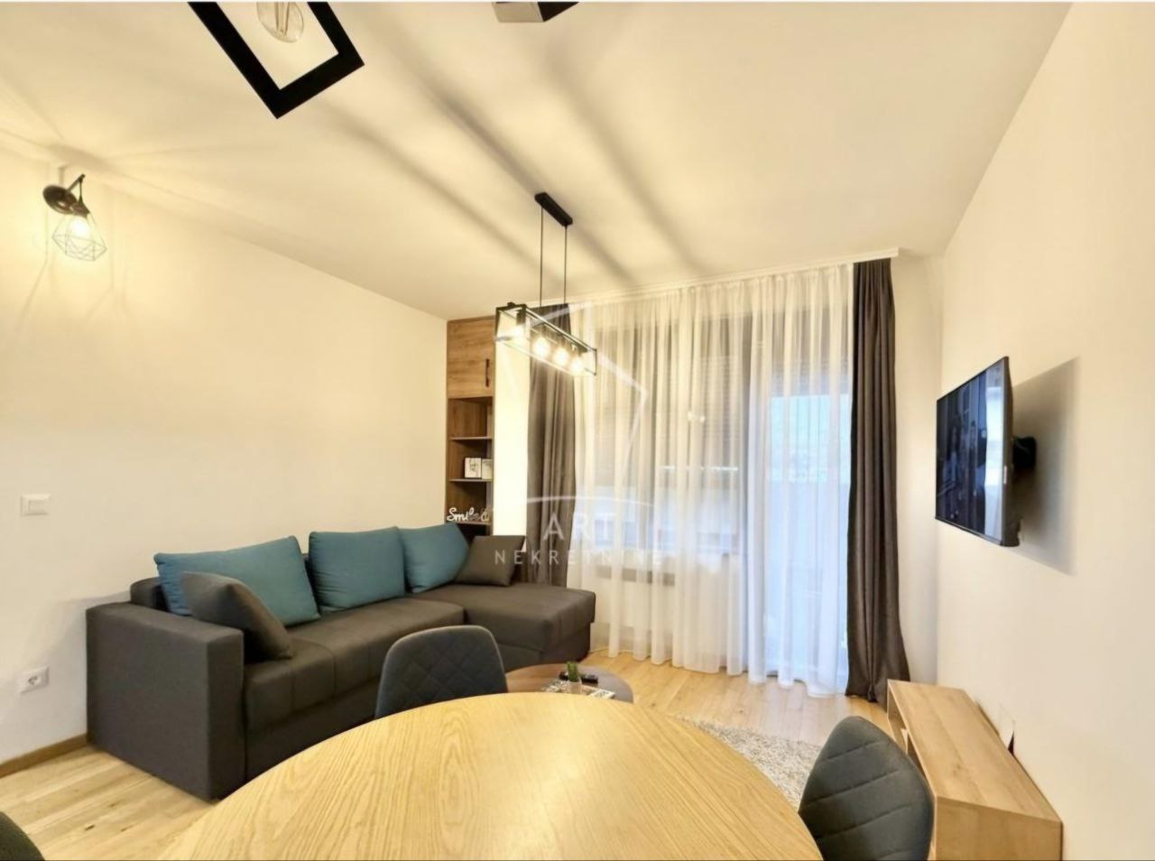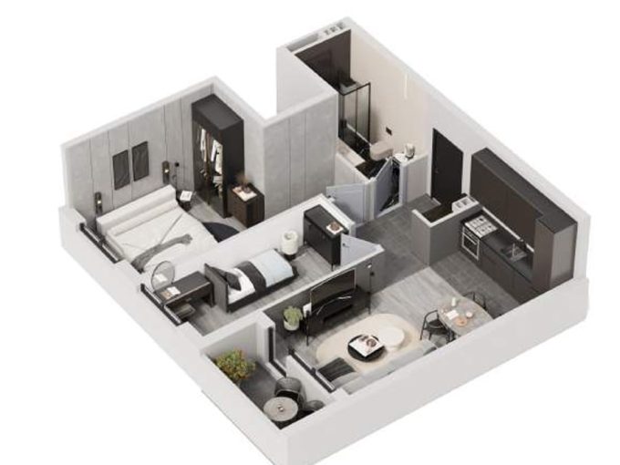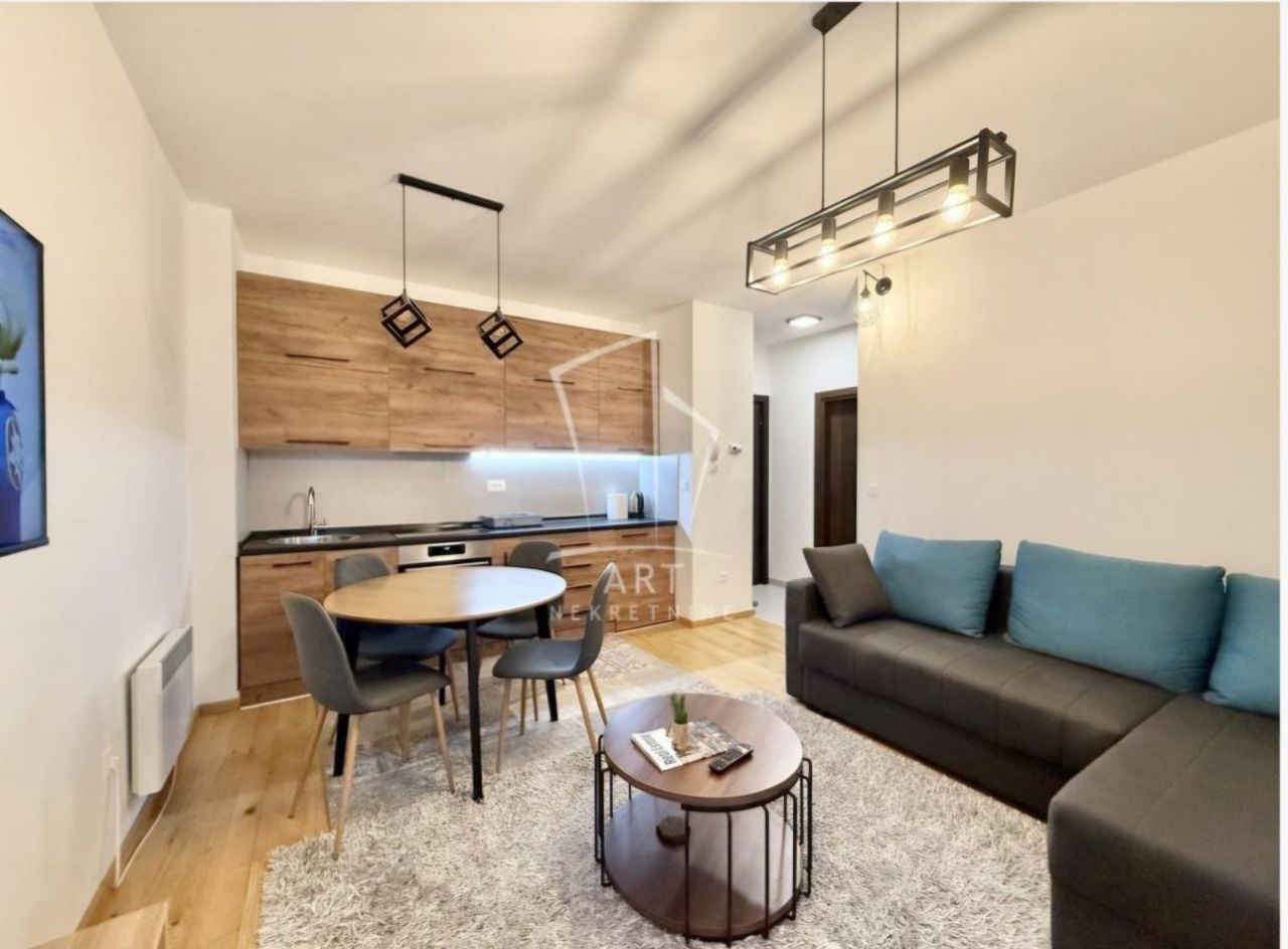 Sastoji se od ulaznog hodnika, boravka sa kuhinjom, trpezarijom i terasom, spavaće sobe I kupatila.