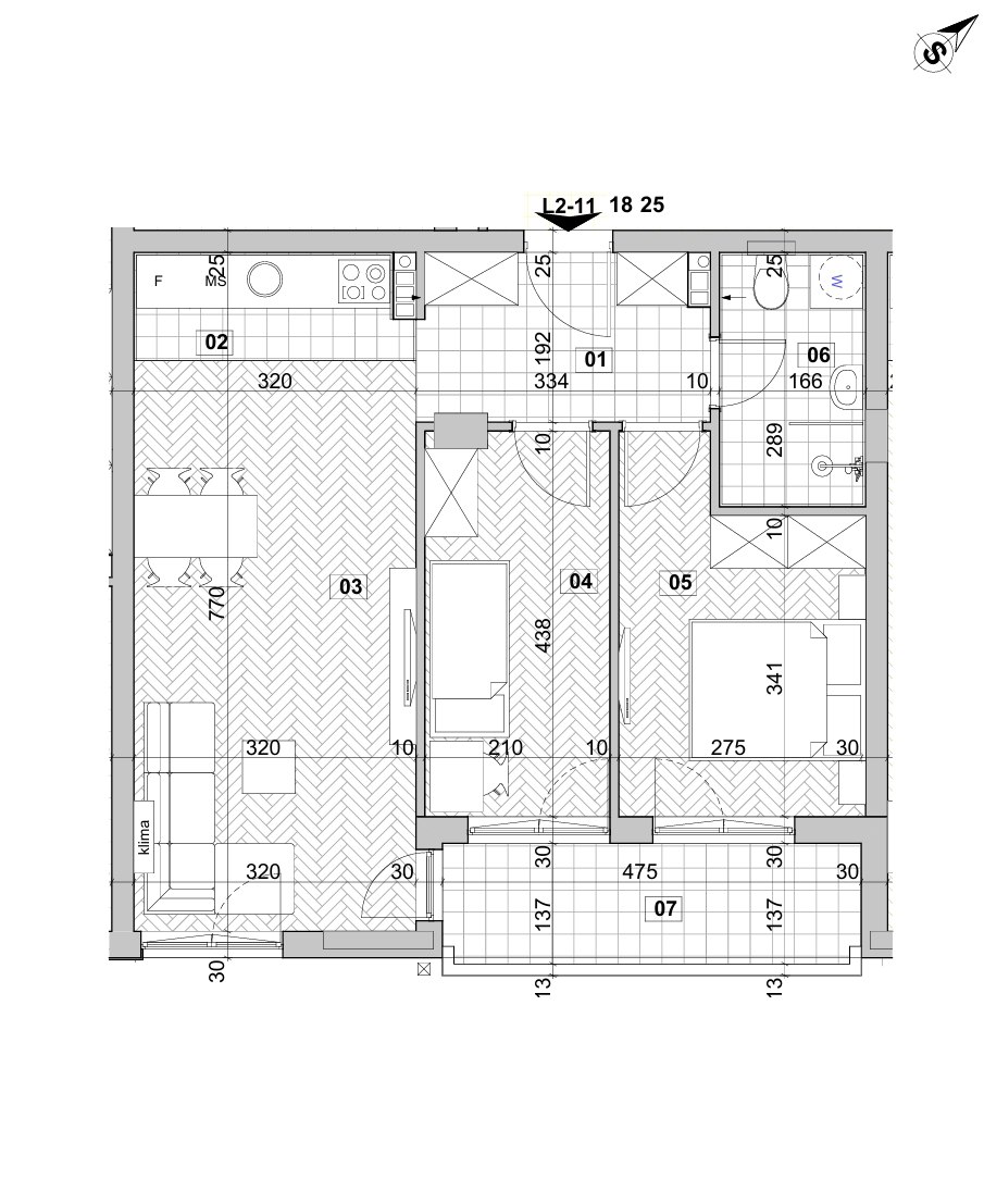 Stan 59.61m² se nalazi na prvom spratu i sastoji se iz hodnika, dnevne sobe sa kuhinjom i trpezarijom, 2 spavaće sobe, kupatila i terase.