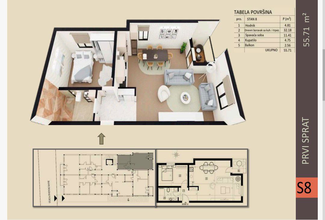 Veliko nam je zadovoljstvo što smo u mogućnosti da Vam ponudimo dvosoban stan 55.71m², koji se nalazi na prvom spratu stambene zgrade koja se nalazi na jednoj od najboljih lokacija u Obrenovcu, svega 1 km od centra.
