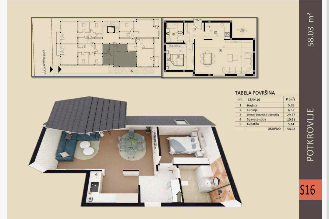 Veliko nam je zadovoljstvo što smo u mogućnosti da Vam ponudimo dvosoban stan 58.03 m², koji se nalazi na potkrovlju stambene zgrade koja se nalazi na jednoj od najboljih lokacija u Obrenovcu, svega 1 km od centra.