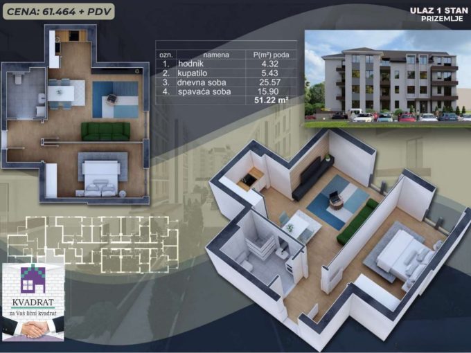 Na prodaju jednoiposoban stan površine 51,22 m² u prizemlju stambene…