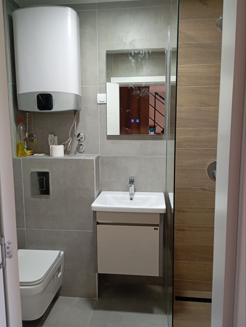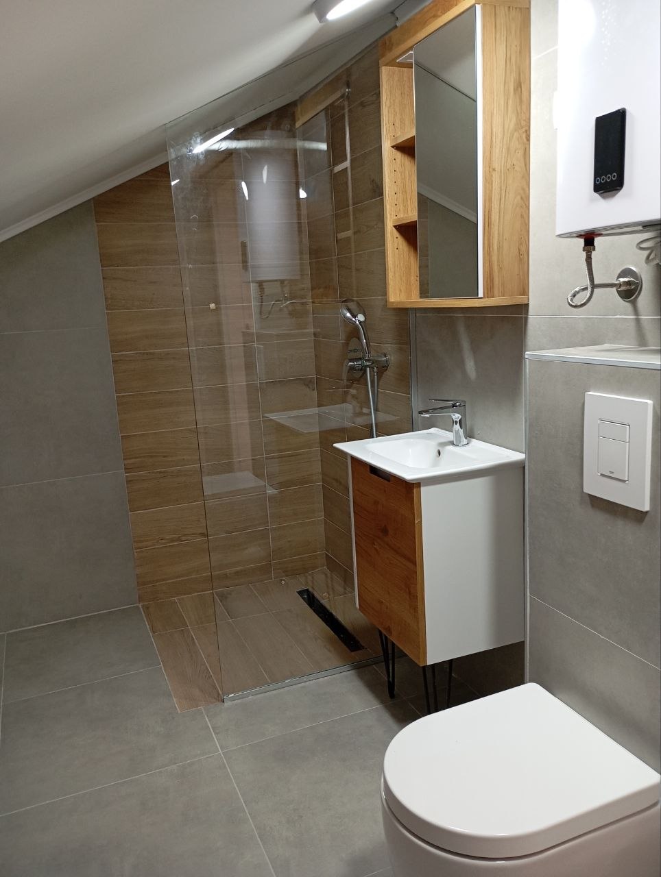Sastoji se od ulaznog hodnika, dnevnog boravka sa trpezarijom i kuhinjom, tri spavaće sobe, tri kupatila i terase. Podno grejanje, na struju.
