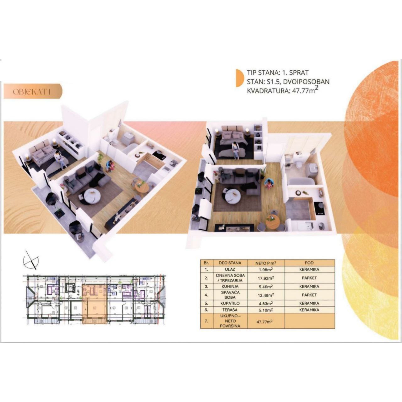 Veliko nam je zadovoljstvo što smo u mogućnosti da Vam ponudimo jednoiposoban stan 47.77m², na prvom, drugom spratu, kao I u potkrovlju zgrade, koja se nalazi na odličnoj lokaciji, svega 2 km od centra Obrenovca.