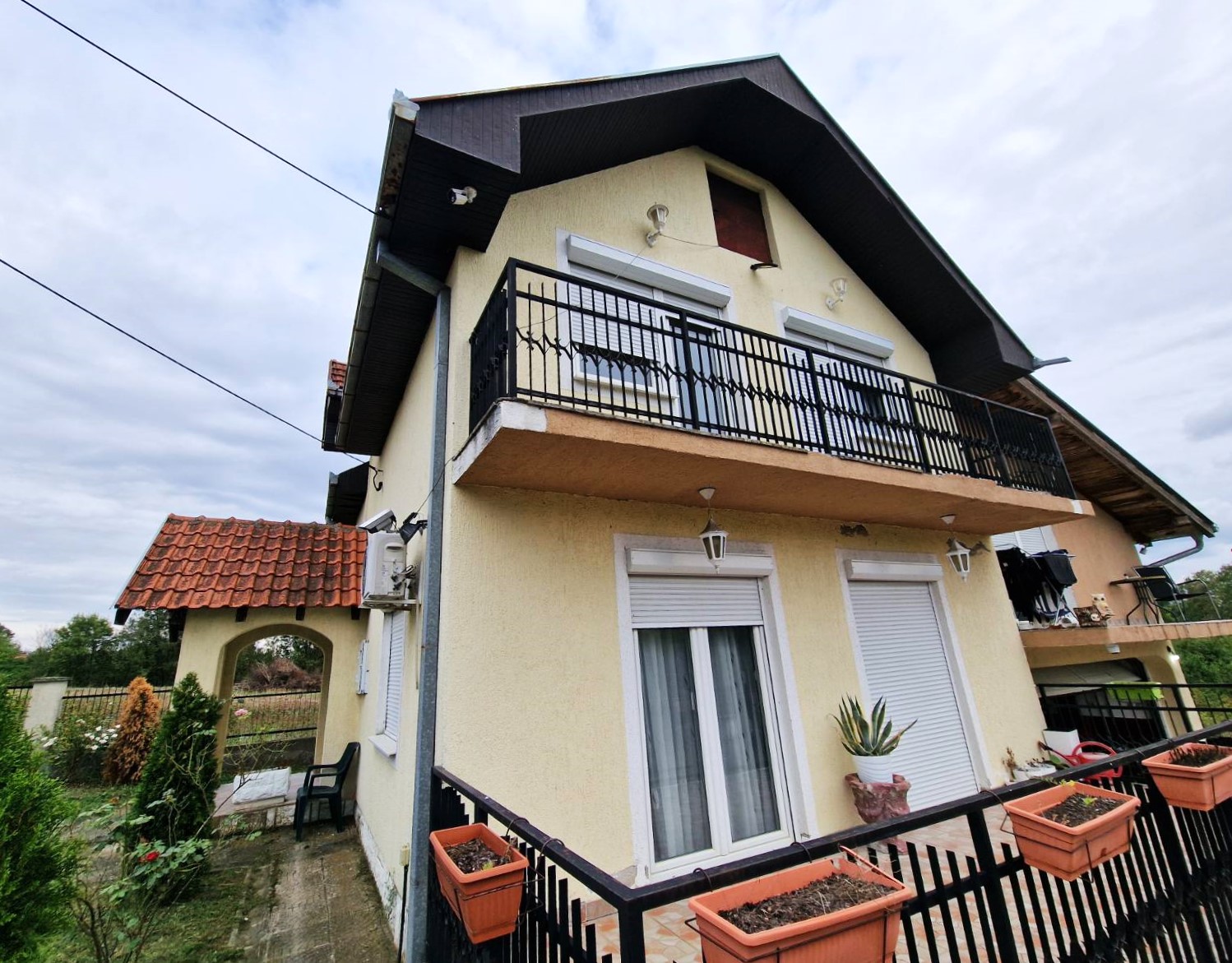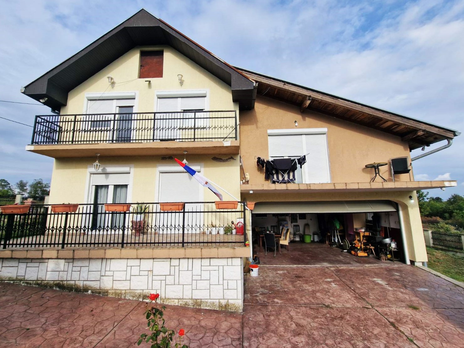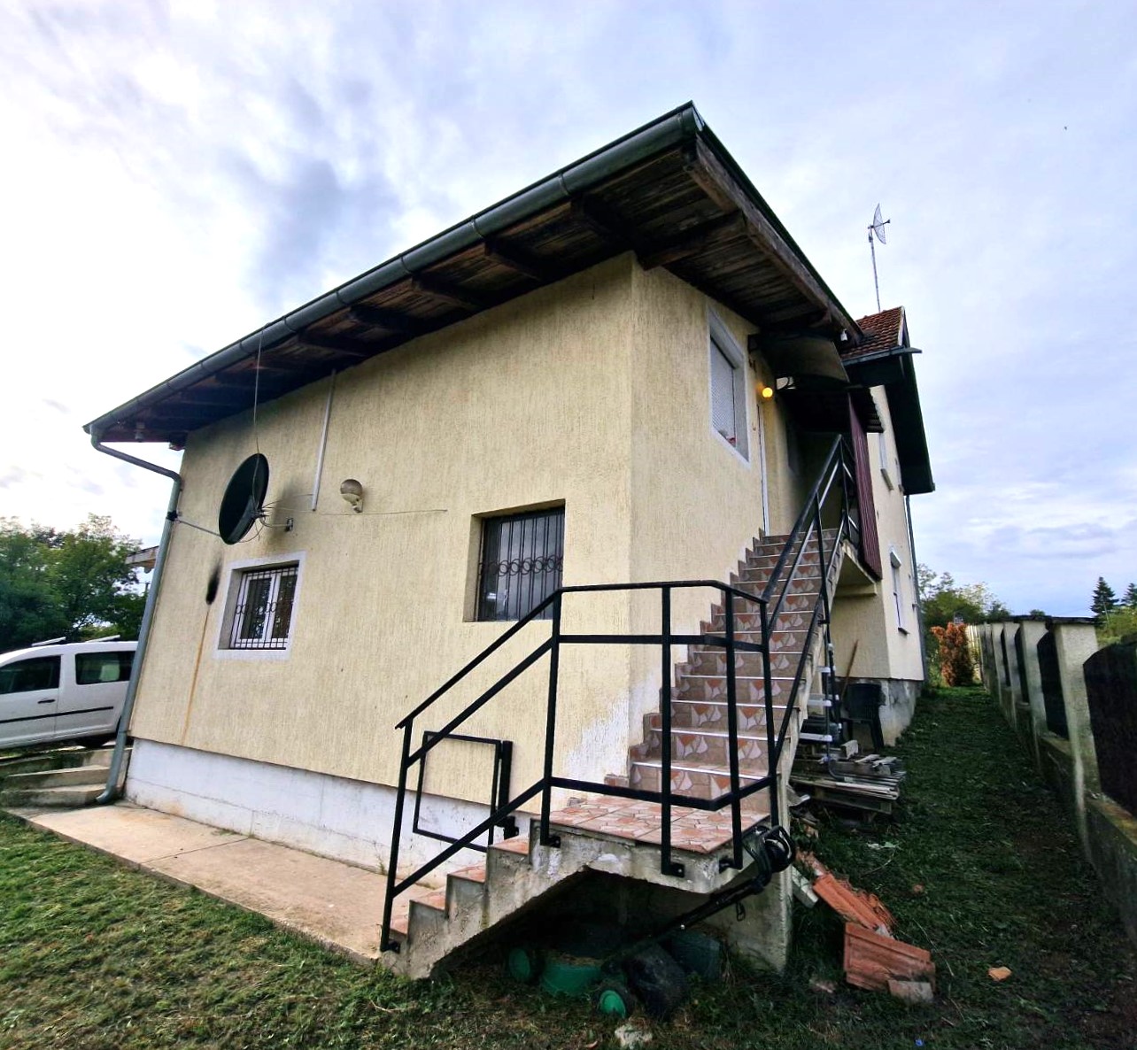 Drugi deo kuće podrazumeva spoljno stepenište koje vodi na potpuno zasebnu stambenu celinu koja poseduje dnevni boravak, spavaću sobu, kuhinju sa trpezarijom , kupatilo sa tuš kabinom kao i prostranu terasu. Na raspolaganju je i ostava u zadnjem delu kuće kao i komforna garaža sa rolo vratima.